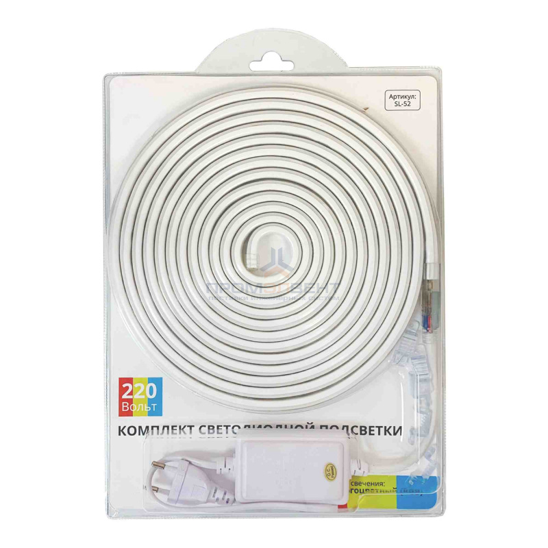 SL-52 Комплект светодиодной ленты 220В, 12Вт/м, smd5050, 60д/м, IP44, 700Лм/м, ширина подложки 12мм, 5м, RGB, оплетка из белого ПВХ, с аксессуарами (шнур питания 220В с кнопочным RGB контроллером, заглушка-1шт., крепеж-5шт.). – поставка оптом и в розницу от компании «ПромЭлВент». Цены от производителя: доставка по Забайкальске и всей России. Скидки на объем!